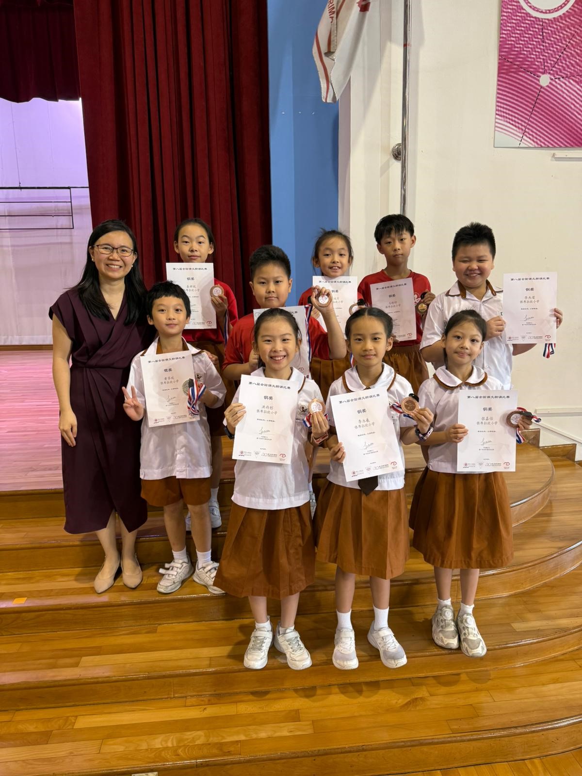来自三年级的李沐羲、张嘉怡、洪雨彤和汪天泽获得了低年级团体组铜奖。来自四年级的张议斤和马皓轩以及来自五年级的秦妍妩和李杰荣获得了高年级团体组铜奖。在高年级个人组比赛中,五年级的卓慧敏得到了铜奖,四年级的黄齐欢则夺得了银奖。
